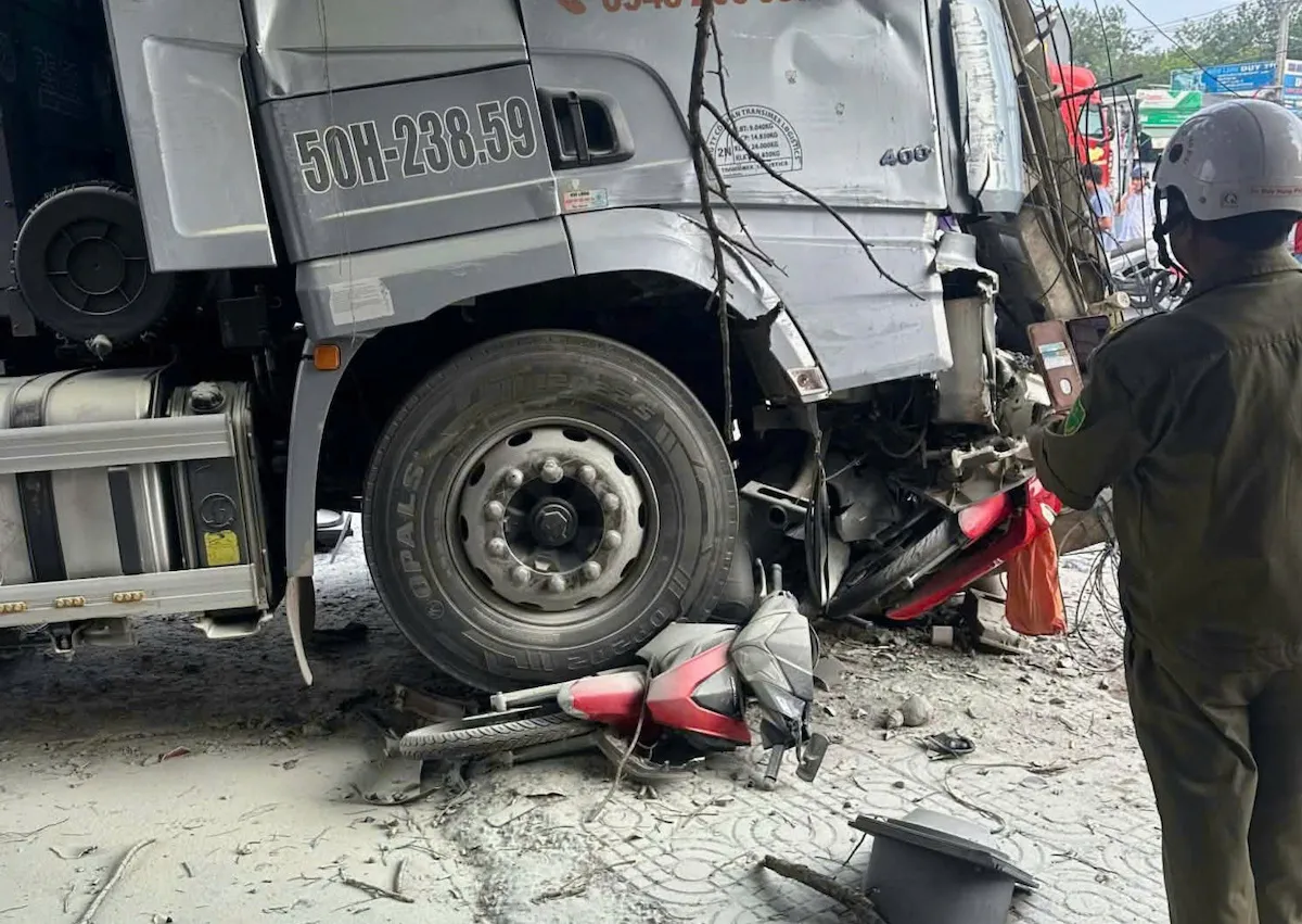 Đồng Nai - Sau khi tông vào xe đầu kéo phía trước, ôtô container lao sang phải, cuốn nhiều xe máy đang đậu bên đường, tài xế bị thương nặng.